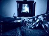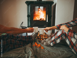 Feet in woollen socks by the Christmas fireplace. Family sitting relaxes by cozy authentic fireside with a cup of hot drink and warming up their feet. Winter and Christmas holidays concept