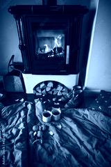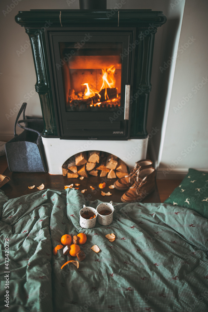 Mugs with tea or hot wine by the warm cozy fireplace. Relaxing atmosphere in a chalet by authentic vintage fireside with a cup of hot drink. Winter and Christmas holidays concept