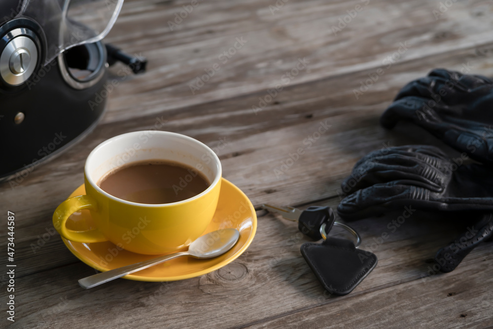 yellow coffee cup on the vintage dark wooden table