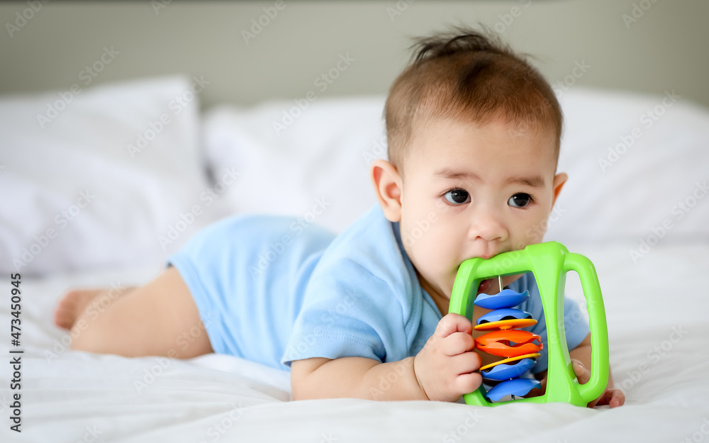 Adorable and innocent little Asian baby enjoys playing fun with colorful children toy while lying on stomach on bed.