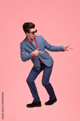 Cool businessman pointing away with forefingers