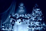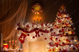 Christmas tree decorated with Lights in Fireplace Room with Candles, Red Stocking, Wreath and Clock on Wall. Shining White Xmas Tree at New Year Night Eve