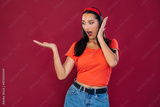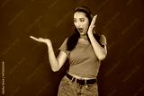 the girl amazes with the expression on her face, indicates something. pretty young woman demonstrating something. One hand is on her head and the other hand is showing.