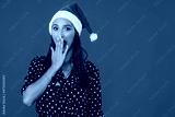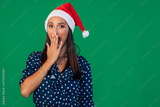 Studio portrait of a young surprised woman with long hair, in a dress and hat of santa claus, posing against a green wall, covering her mouth with her hand.
