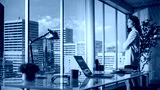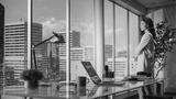 Ambitious Caucasian Businesswoman Standing in Office Looking out of Window on Big City. Confident Overachieving Female Digital Entrepreneur Thinking about Investment Strategy for e-Commerce Software
