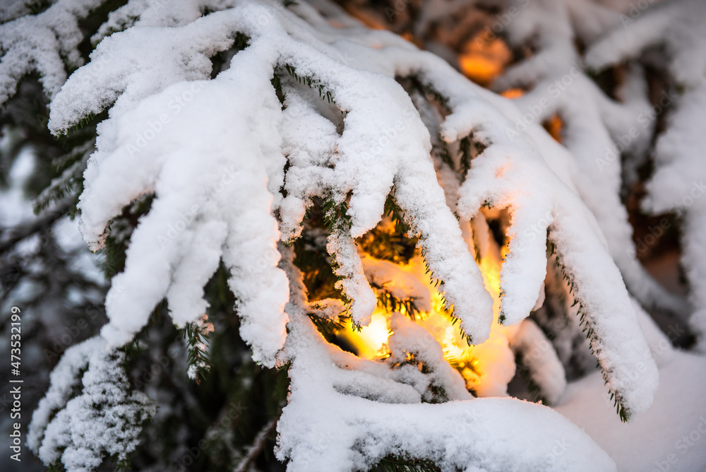 Snowy Christmas tree branches and yellow light under them