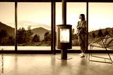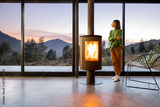 Woman enjoy great view on mountains while sitting near fireplace at modern living room at sunset . Concept of rest in houses or cabins on nature. Solitude in nature and escape from everyday life