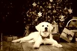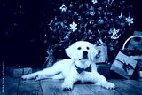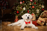 White Puppy Retriever lying down under Christmas Tree as Gift. Dog with Red Bow Tie in Home Room Decorated for New Year Winter Holiday