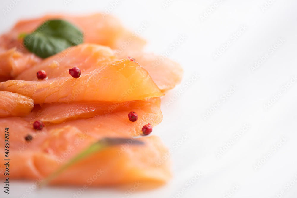 Slices of smoked salmon on white background