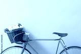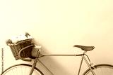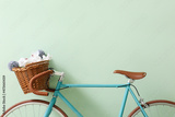 Stylish bicycle with wicker basket and flowers near green wall