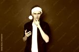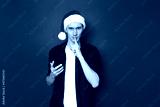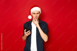 Shh. Keep secret. No sound mute silent confidential, privacy quiet, shush hissing hush concept. serious with forefinger by his lips, phone in hands. Festive holly jolly xmas. isolated studio red wall