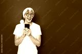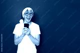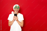Concept - people Smiling excited young man in casual blank white t-shirt xmas hat christmas tree glasses posing on red studio wall. Using mobile cell phone typing sms message browsing looking aside up