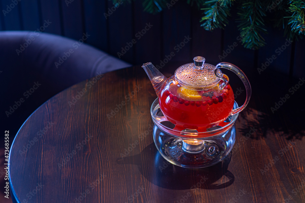 Hot fruit drink in a transparent teapot with a candle on the background of New Year's decoration.
