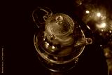 Hot fruit drink in a transparent teapot with a candle on the background of New Year's decoration.