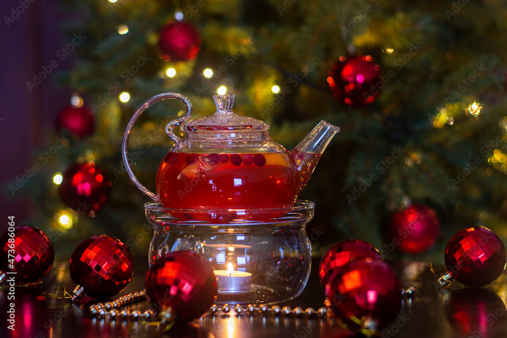 Hot fruit drink in a transparent teapot with a candle on the background of New Year's decoration.
