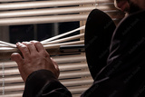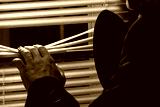 A directional microphone cannon for eavesdropping and recording conversations at a distance is exposed through the blinds to the window by a private detective, spy devices, selective focus, close-up.