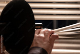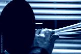 A directional microphone cannon for eavesdropping and recording conversations at a distance is exposed through the blinds to the window by a private detective, spy devices, selective focus, close-up.