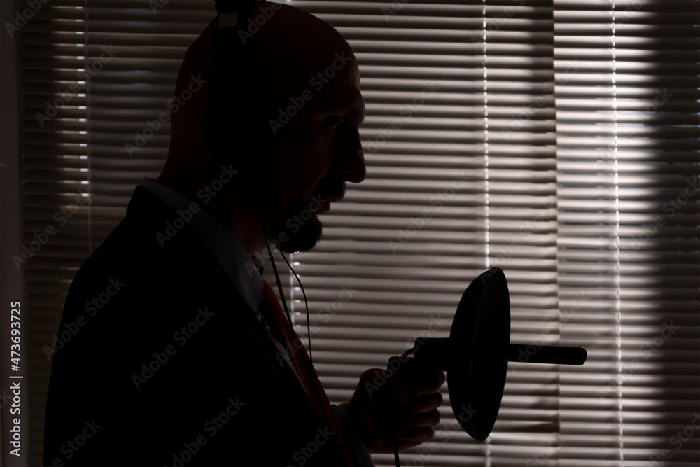 An FBI secret agent listens with headphones and records a conversation against the background of a window with blinds, silhouette lighting, selective focus, dark tone.