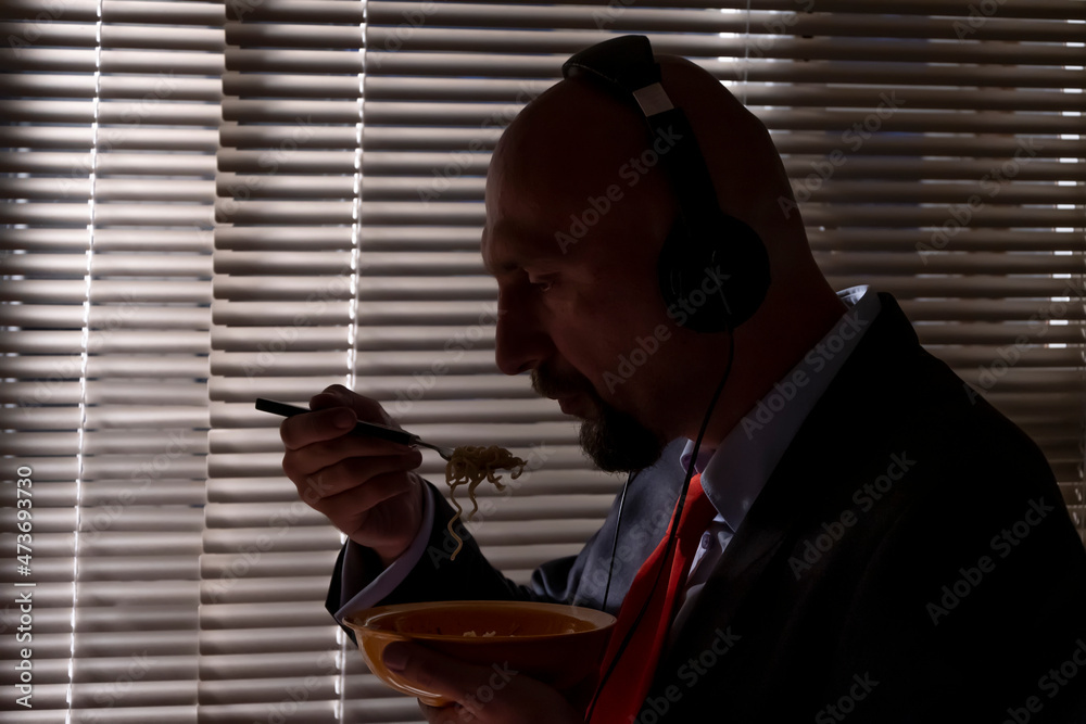A man in a suit and headphones eats pasta against the background of a window with blinds. A special agent's lunch at work, wiretapping conversations.