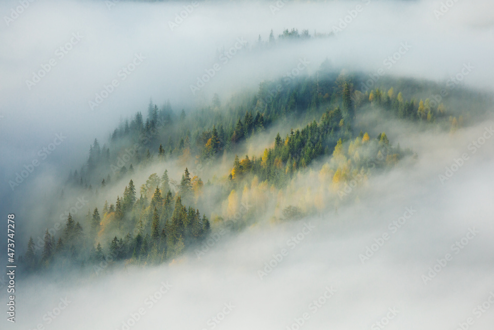 View of the forest in the fog. Carpathian mountains , the village of Dzembronya. Ukraine