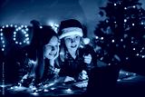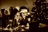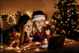 Two charming sisters lie on the bed with a laptop on Christmas or New Year's eve and congratulate their friends and relatives online. Christmas greetings online, virtual party for Christmas