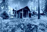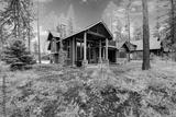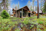 Mountain cabin home exterior with forest and flowers.