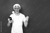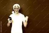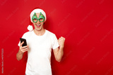an excited happy man with phone in hands, white T-shirt, Christmas hat, celebrates victory, rejoices in good news notification in application. concept - new year, people, technology, communication