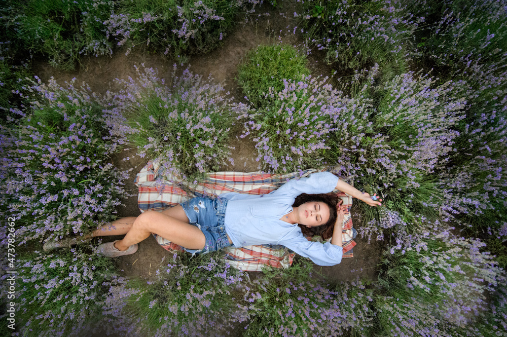 top view, beautiful, sexy girl lying in a lavender field, time to relax