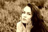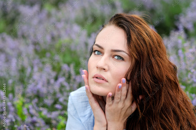 Beautiful lady portrait, on lavender field background, makeup, beauty concept