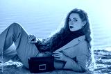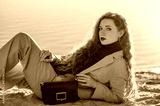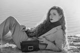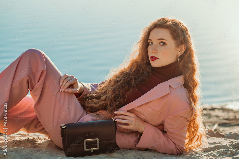 Outdoor fashion portrait of elegant woman wearing pink suit with blazer, trousers, marsala color turtleneck sweater, holding classic faux leather bag. Copy, empty space for text