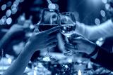 holidays, drinks and celebration concept - close up of hands toasting wine glasses at dinner party on christmas at home