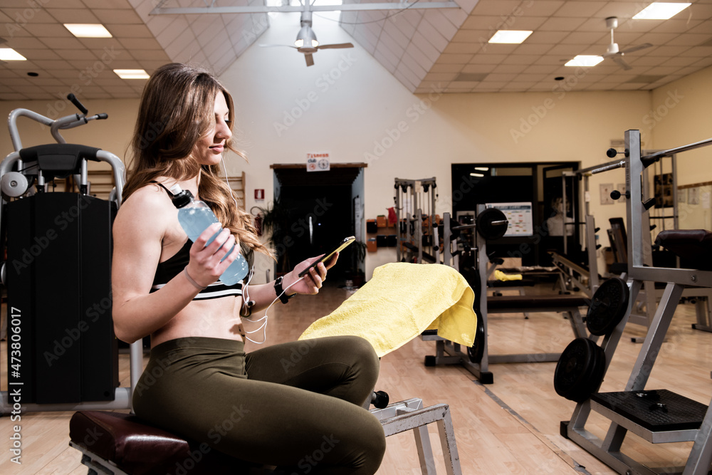 Woman in sportswear resting after dumbbells exercises in gym