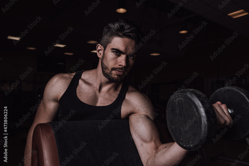 Muscular man working out in gym doing exercises with dumbbells at biceps