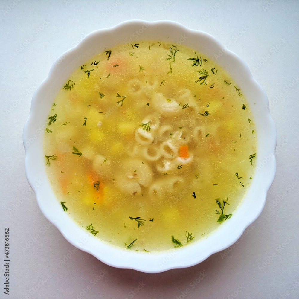 Plate of fresh tasty pasta soup with herbs and carrots on white plate