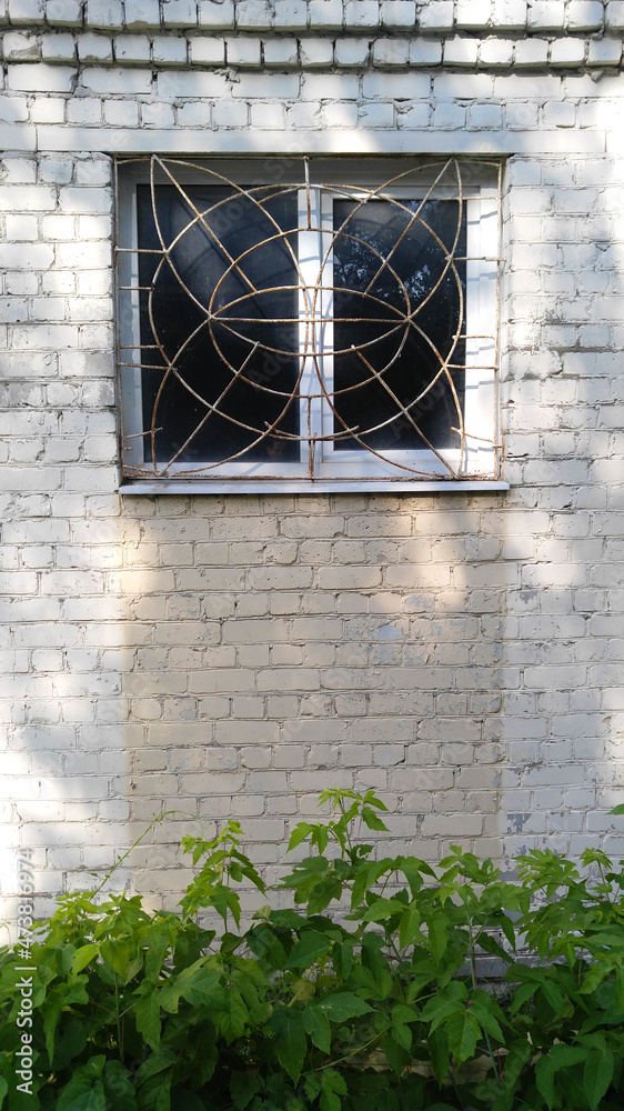 Window with a metal grate on the background of an old white brick wall and green vegetation