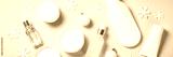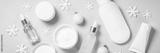 Winter cosmetic, skincare product for woman beauty. Cream, serum, tonic with winter decorations. Long banner format.
