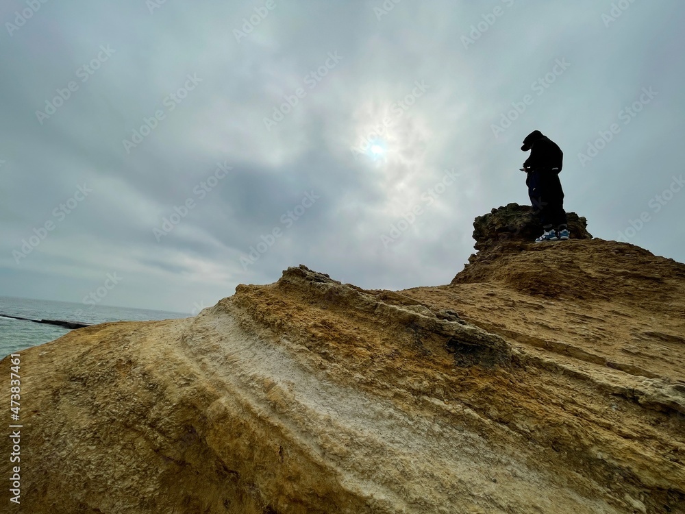 Unrecognizable man standing on top of a yellow rock at the seashore