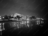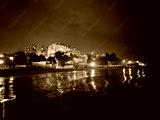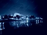 Night cityscape view from sea pier of shoreline town, copy space