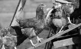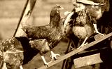 A group of brown domestic chickens climb up a chicken ladder, outdoors in front of a green meadow