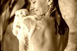Happy young woman applying shower gel on her body using loofah sponge while taking shower. Spa and body care concept
