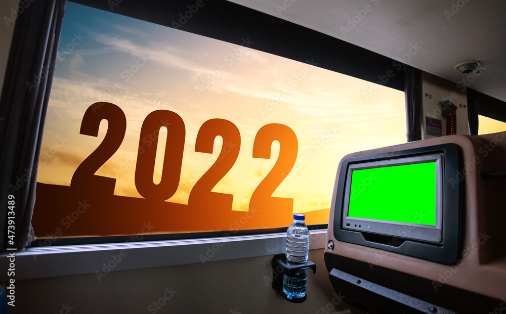 Happy New Year 2022,Inside of the bus which has LCD screen blank rear seat for entertainment with a bottle of water and window view of Beautiful landscape nature with sky cloud sunset,Figure tourism