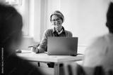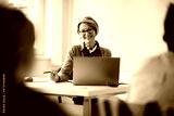 Happy elementary teacher uses laptop while teaching her students in classroom.