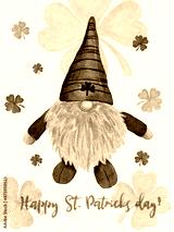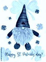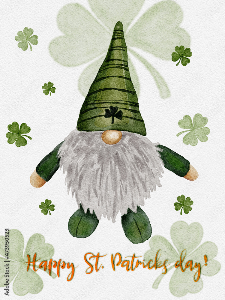 St Patrick day leprechaun in striped hat with four leaves clovers,Greeting card A gnomes with shamrock a luck symbols.illustration Watercolour green Scandinavian dwarf collection in Celtic Irish style