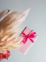 pink envelope with ribbon, declaration of love, congratulation letter. Dry wild flowers over pastel pink background. Greeting card