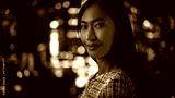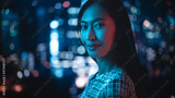 Beautiful Asian Female Portrait Standing on City Street with Neon Lights Late in the Evening. Authentic Adult Confident Woman Posing For Camera, Smiling in the Night on Downtown Business Street.