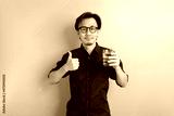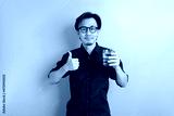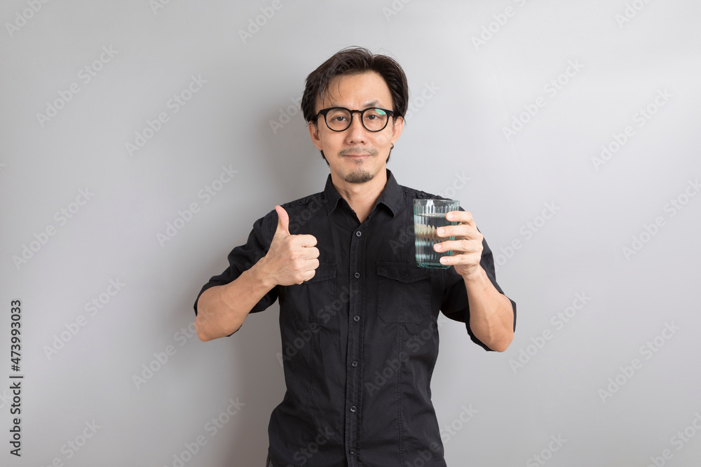 Asian man with glasses of water wearing black shirt drink fresh water stand on grey background.