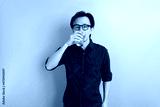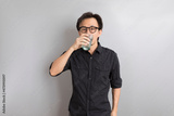Asian man with glasses of water wearing black shirt drink fresh water stand on grey background.