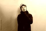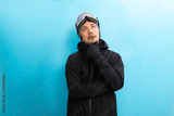 Winter sport. Handsome asian man with snowboard goggles and black anorak coat with curious face stand on blue background.
