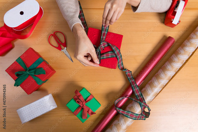 Women's hands prepare boxed gifts for the holiday season. Top view.