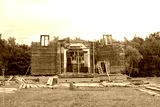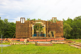 Building a residential wooden house. Facade of unfinished building without roof. A process of disassembling or assembling a hut in nature against green grass, forest. Construction or renovation.